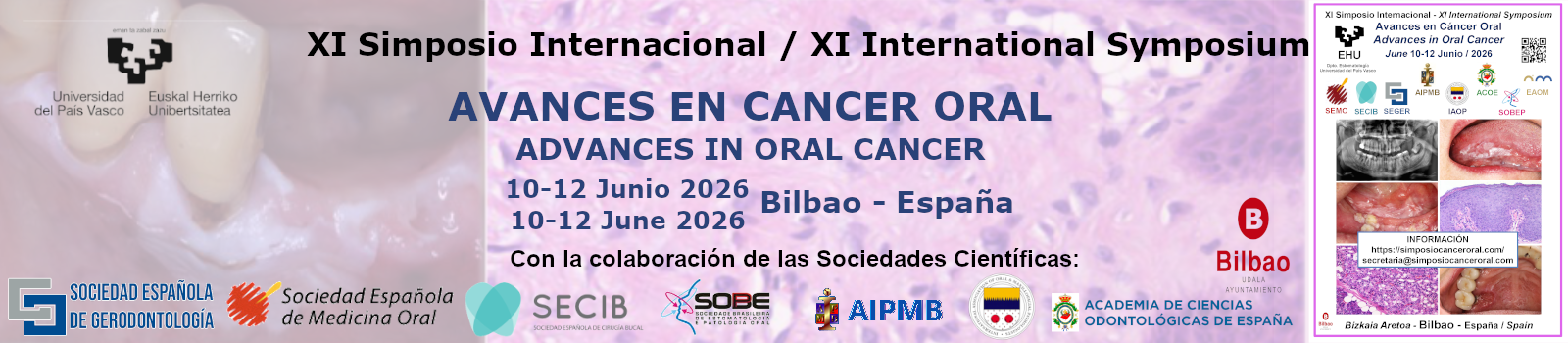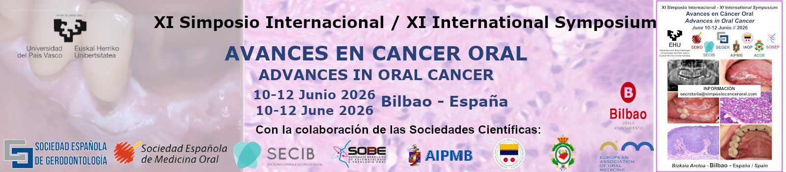 Desde el Departamento de Estomatología de la Universidad del País Vasco/Euskal Herriko Unibertsitatea (EHU), hemos organizado el XI Simposio Internacional Avances en Cáncer Oral titulado “Mejoremos el pronóstico del cáncer oral” en formato presencial, que celebraremos del 10 al 12 de Junio de 2026, en el Paraninfo del Bizkaia Aretoa de la EHU en Bilbao (España).